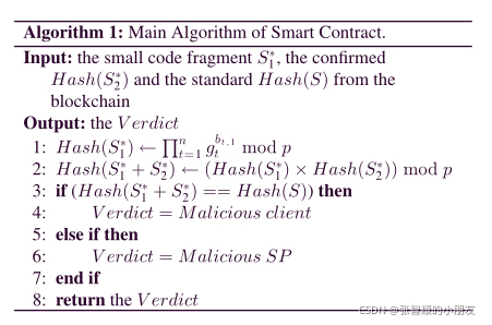 当C和SP在最后一步申请仲裁时,智能合约将被调用。它首先使用同态哈希函数来计算次要代码片段的哈希值在区块链上发布的内容,然后通过计算Hash()×Hash()mod p获得Hash(),将其与区块链上的预存散列进行比较。最后,如果Hash()==预先存储的散列,则智能合约将判定该C是恶意的,因为它会带来虚假指控。否则,它会得出结论,SP是恶意的。