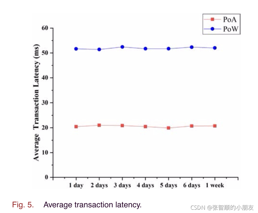 每天随机启动100000个事务请求,并使系统运行一周。对于不同的时间段,平均事务延迟保持稳定,PoA机制下的平均事务延迟仅约为21毫秒,而PoW机制下的平均事务延迟约为52毫秒,即使在极低的挖掘难度下,其速度也是ap的两倍多(约250%),这也反映了采用的POA机制的优越性。