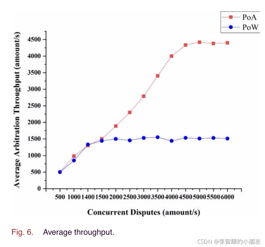如图所示。基于PoA的方案的平均仲裁吞吐量随着并发争议的增加而稳定增长,当并发争议的数量大于4500/s时,它逐渐达到稳定峰值,即大约每秒4500个。对于基于PoW的方案,仲裁吞吐量曲线更平坦,最大值为每秒1500。基于PoA的方案的吞吐量优于基于PoW的方案,并且足以满足解决争端的实际需要。