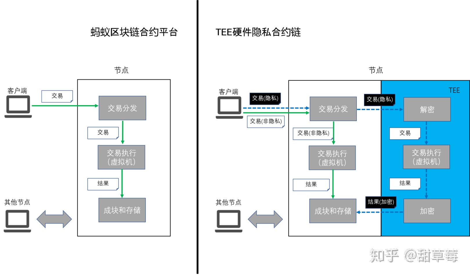 因此,蚂蚁区块链设计了一个由加密传输、加密存储、密钥管理和可信执行环境(TEE)构成的端到端、全声明周期机密性保护机制,而不是拆分出来加密或执行。机制成为蚂蚁区块链硬件隐私保护技术,CONFIDE(confidentiality in financial grade blockchain)。