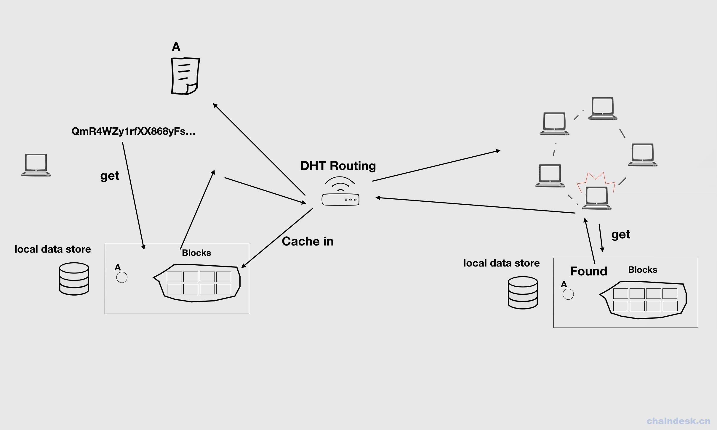 - 对等节点通过DHT和路由层算法,找到每个block hash所在的节点,将文件返回来;