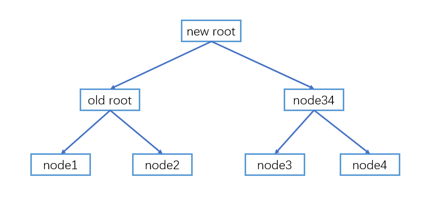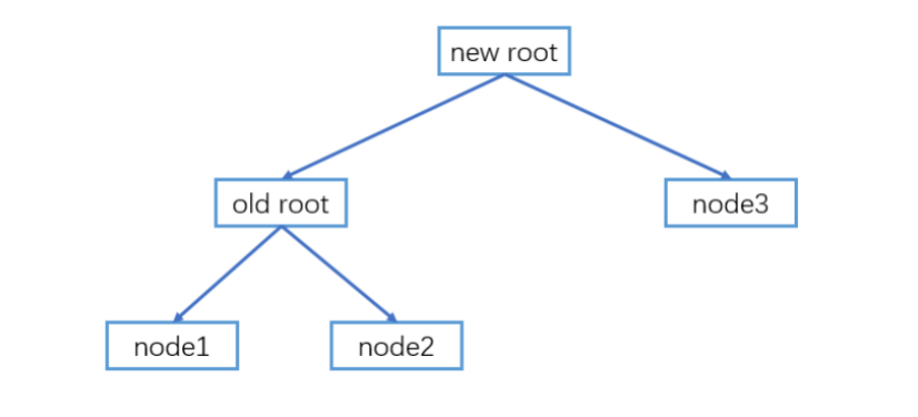 如下图所示,超过174个后则会新创建一个new root节点,并Link到old root,新的chunk作为node3(这里用node3简约了,实际上是第175个节点)被new root直接Link。