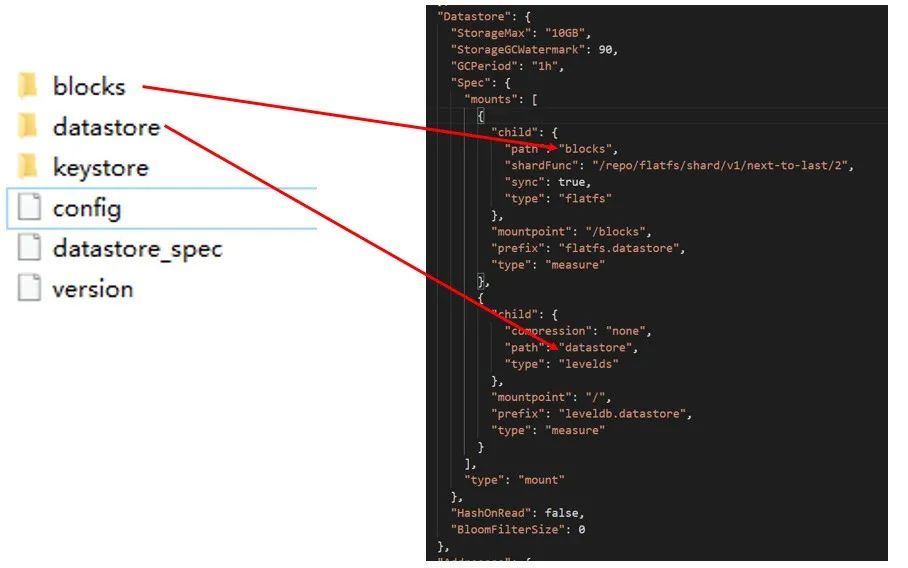 IPFS在init的时候会生成.ipfs目录,如下图所示,其中blocks则为文件块存储的目录,datastore为leveldb数据库,其中存储了文件系统的根哈希等,存储相关的配置关联在.ipfs目录下面的config文件。