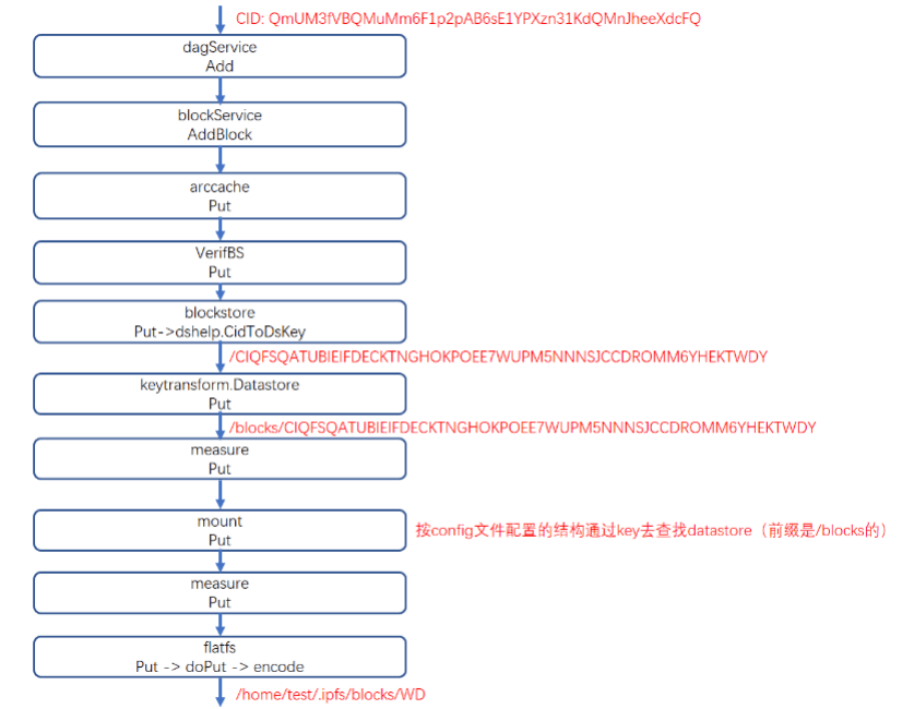 - 之后调用mount的Put函数,mount和IPFS的config配置文件中结构对应,根据key去查找对应的datastore,由于前缀是/blocks则可以找到对应的measure;