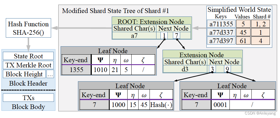 要启用状态图分区和帐户分割操作,BrokerChain必须强制每个分片了解所有帐户的存储映射。因此,基于以太坊的MPT状态树设计了一种改进的分片状态树(mSST),以存储帐户状态。与MPT树不同,BrokerChain的mSST构建在所有帐户的存储映射上。定义如下: