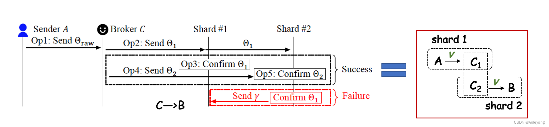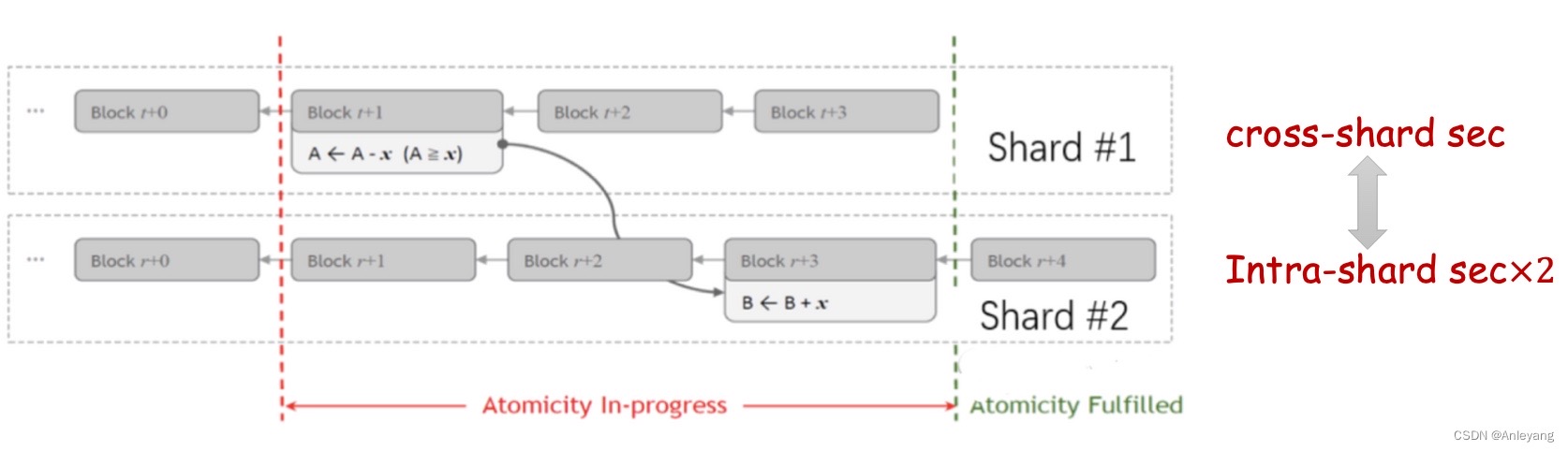 在跨分片交易的成功案例中,一旦被成功写入目标分片的区块链(shard#2),接收方B就能收到这笔v个货币的转账。从另外一个方面讲,只有当shard#1的块高度大于 +1时,A向C支付的v个货币才能解锁,从而发给C。