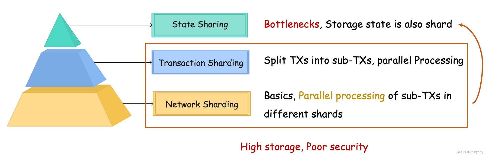 网络分片是基础,而状态分片是瓶颈。 网络分片和交易分片较早被提出,网络中的节点被分到不同的分片中,每个分片针对不同的交易子集进行处理、验证并达成共识。这样不同的交易子集可以被并行处理,各个分片之间也不必进行频繁的通讯。但是会带来存储空间消耗问题,系统的安全性也会越来越差。 因此提出了状态分片,不仅将网络和交易进行分片,将存储状态也进行分片。这样,每个节点只负责存储自己分片的数据,而不是完整的账本状态。