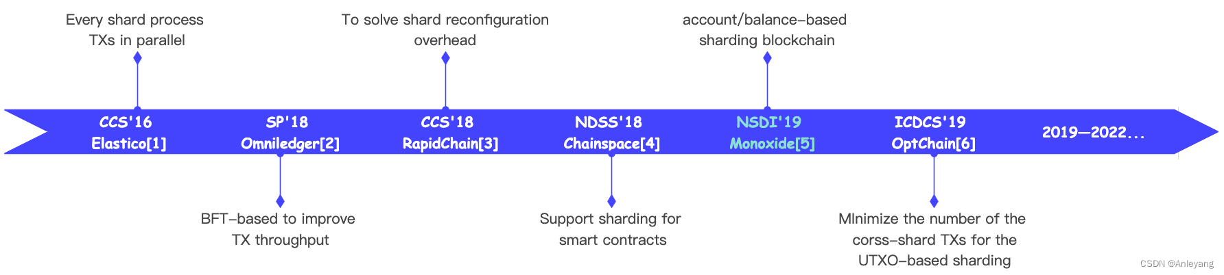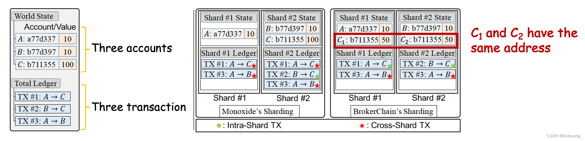 - Monoxide根据账户分配机制减少TXs,根据用户账户地址的前几位划分到不同的分片中,旨在协同存储所有帐户状态。虽然这种方式可以提高系统吞吐量,但不可避免地会产生跨分片TXs。