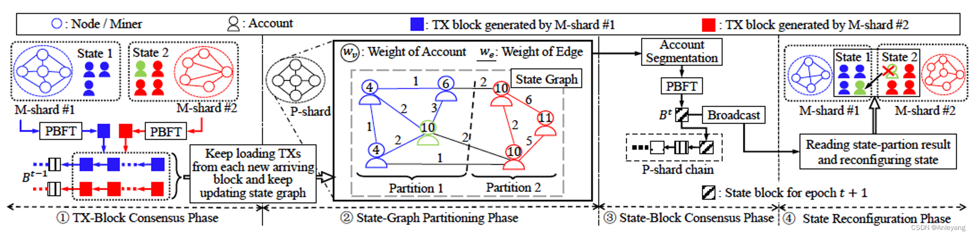 - 状态图分区阶段:P-shard从产生的区块中读取交易并持续更新所有账户的账户图。一旦M-shard生成了当前Epoch中的所有交易块,状态图就固定了。然后,根据Metis算法开始对状态图进行划分,以实现所有分片之间的负载平衡。