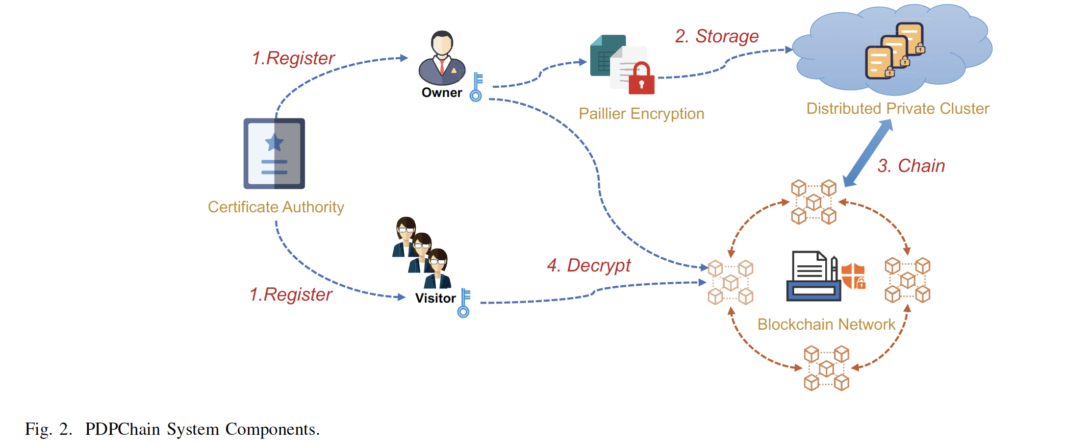 如上图是PDPChain方案的全生命周期存储与共享过程图。
