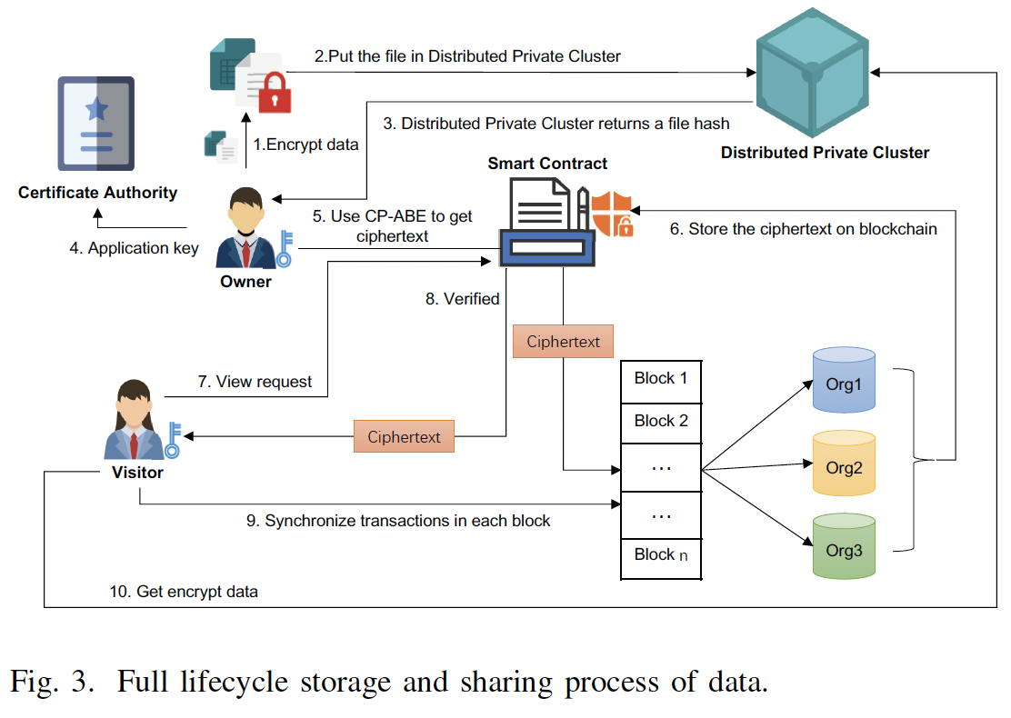 - 区块链网络通过HyperLedger Fabric来保证隐私数据的可信存储。并且结合设计的基于CP-ABE的访问控制方法来保证数据在区块链上进行细粒度访问控制和安全可靠的传输。