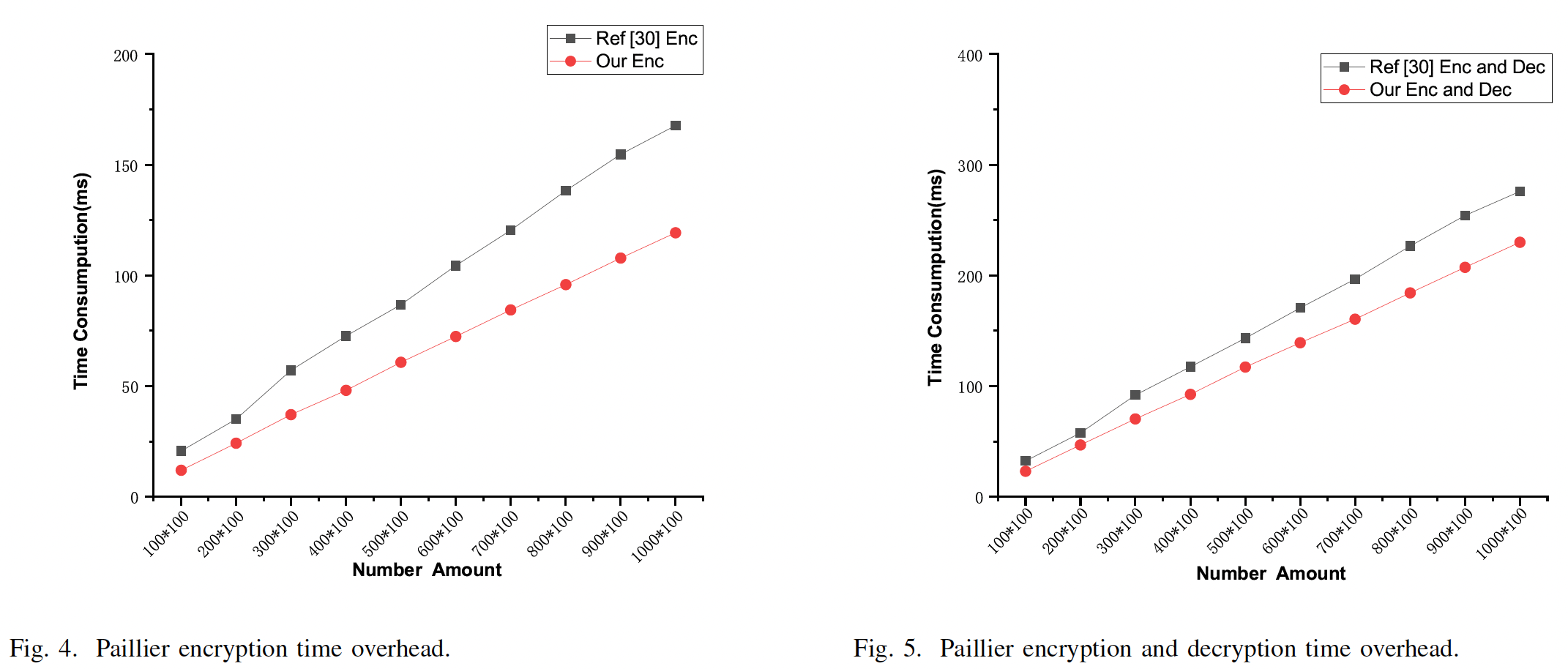 在Paillier同态加解密原始数据耗时部分,与其他方案相比,本文改进的方案加解密整体耗时上降低25%,在加密耗时上降低48%。