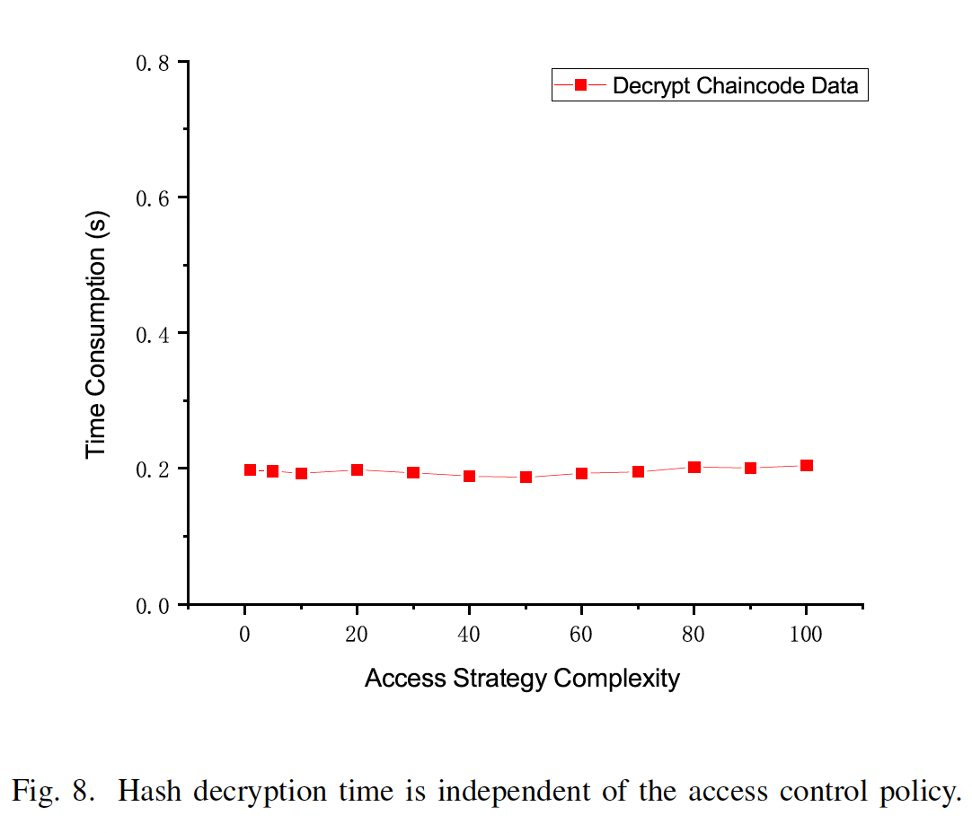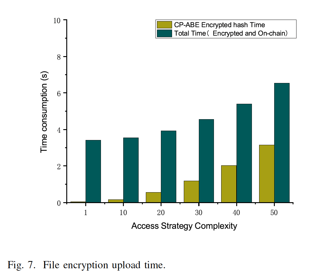 整个文件加密上链时间,是向Fabric-CA获取证书、加密耗时、上链耗时的总和。从图中数据我们可以看出CP-ABE加密技术时间成本在整个上链阶段的开销很小,且时间的递增是随着访问策略复杂度来递增。