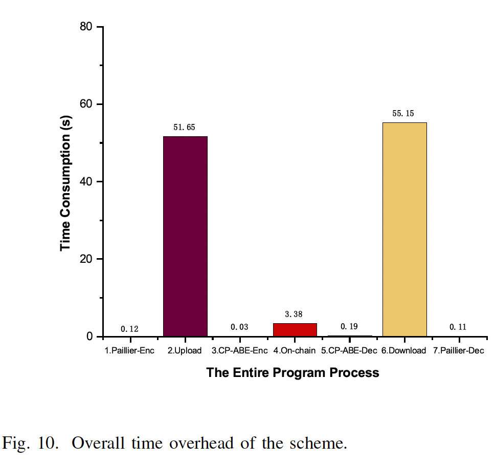 如下图可知,整个方案中耗时占比最高的是文件传输过程,但如上测试结果文件传输速度也有一定的提升,但同时可以看出,本文改进的加密技术中数据上链和加解密时间开销十分小,且整个方案开销非常小。