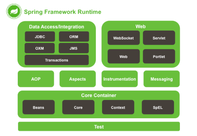Spring 框架是一个分层架构,由 7 个定义良好的模块组成。Spring 模块构建在核心容器之上,核心容器定义了创建、配置和管理 bean 的方式。