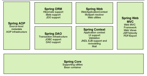 组成 Spring 框架的每个模块(或组件)都可以单独存在,或者与其他一个或多个模块联合实现。每个模块的功能如下:
